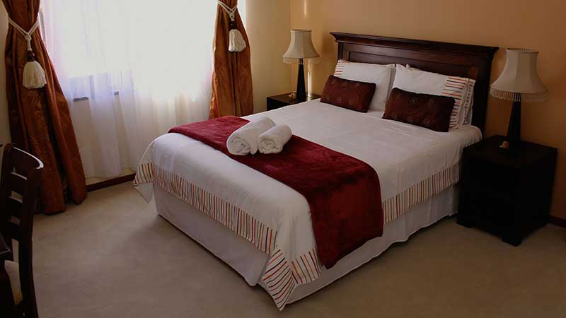 Warm earthy browns room with African features touches. A compact room but comfortable with a double bed, and a large window overlooking the pool and patio.